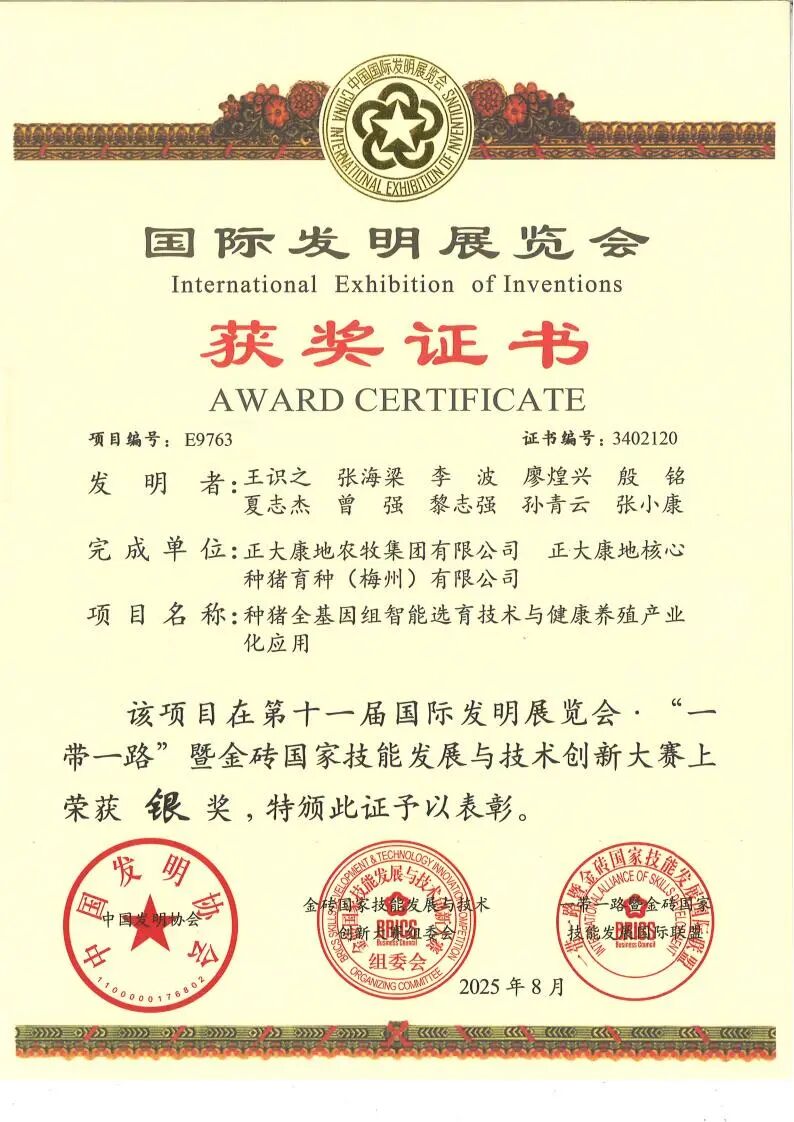 近日,在由中国发明协会主办的第十一届中国国际发明展览会暨“一带一路”暨金砖国家技能发展与技术创新大赛上,正大康地农牧集团参展项目“种猪全基因组智能选育技术与健康养殖产业化应用”荣获发明银奖,标志着正大康地在国内种猪育种算法研究与应用领域中处于领先地位。